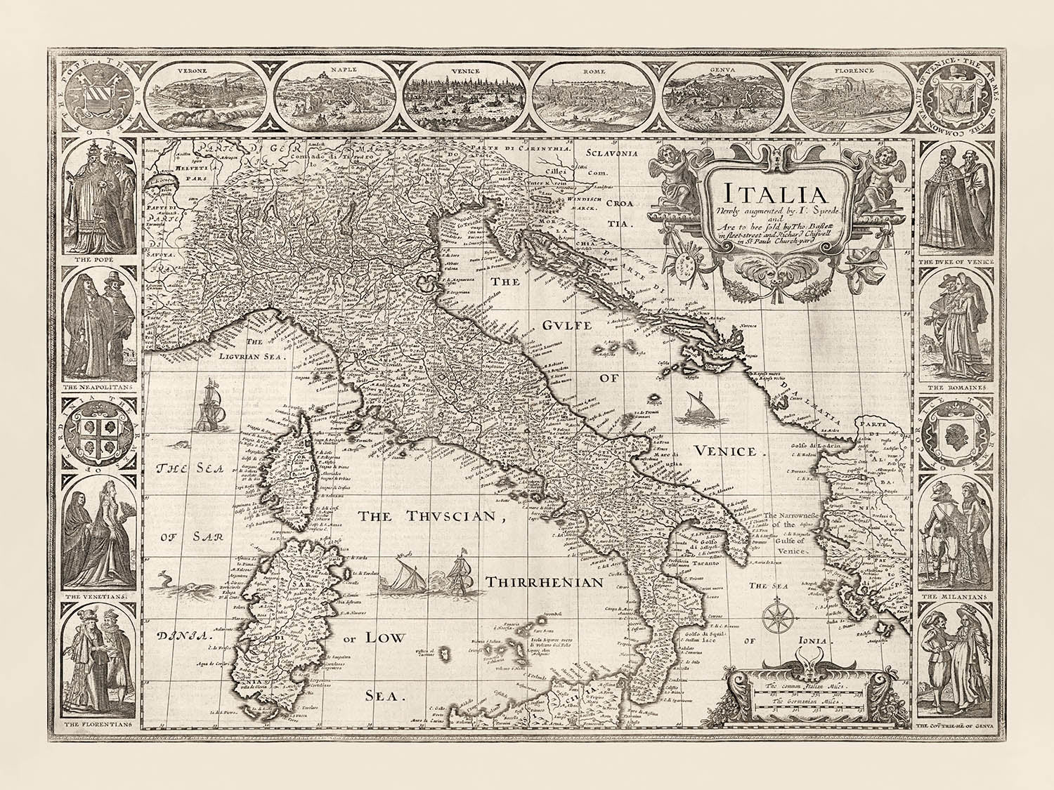 Alrededor del borde del mapa hay algunas maravillosas grabados que muestran seis de las ciudades más importantes de Italia (Verona, Nápoles, Venecia, Roma, Génova y Florencia) - y también dibujos de las personas que habitan Italia, como El Papa, el Duque de Venecia, "Los Milaneses", etc.
