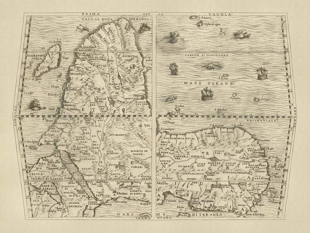 Históricamente significativo, el "Africa Prima Tavola" fue creado después de que el mapa original de madera fuera destruido en 1557, lo que hizo necesario esta exquisita versión grabada para las ediciones posteriores de la obra de Ramusio. Se erige como un testimonio de la búsqueda perdurable de conocimiento y el deseo de cartografiar lo desconocido, cerrando la brecha entre las antiguas teorías geográficas y la creciente era de exploración.