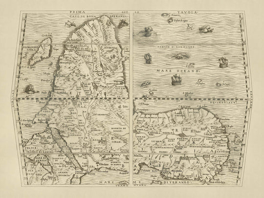 El diseño del mapa es tanto intrigante como visualmente impactante, con su orientación invertida desafiando las perspectivas convencionales. Las detalladas grabados representan cadenas montañosas, cuerpos de agua y una miríada de nombres de lugares, ofreciendo un rico tapiz del continente africano tal como se entendía a mediados del siglo XVI. La inclusión de barcos y criaturas marinas en los océanos circundantes añade un toque de fantasía y resalta la exploración marítima que fue central en los descubrimientos de la época.