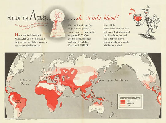Apuesto a que no sabía que el Dr. Seuss hizo una vez un mapa del mundo ... eso se trata de proteger a los soldados estadounidenses de la malaria durante la Segunda Guerra Mundial. Este mapa se publicó originalmente en 1943, en un momento en que la malaria estaba causando más hospitalizaciones que la batalla. bajas en algunos teatros.