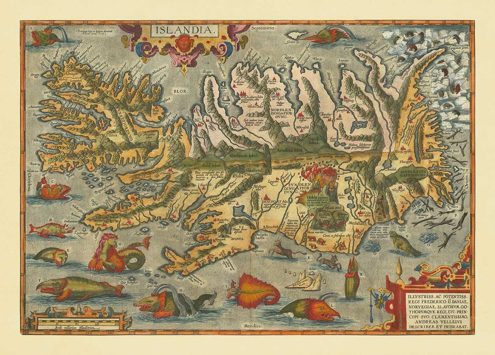 Muchas de las ciudades y aldeas de Islandia están mostradas en este mapa, aunque sus nombres pueden ser diferentes a sus formas modernas. Esto se debe principalmente a un problema de traducción: Ortelius basó este mapa en el trabajo de un islandés, y probablemente no pudo interpretar algunas de las letras inusuales utilizadas en su idioma.