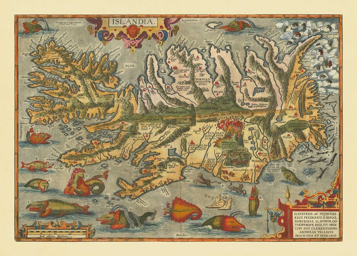 Mapa antiguo raro de Islandia por Ortelius, 1603: Reykjavik, Keflavik, volcanes, montañas, fiordos, glaciares, monstruos marinos