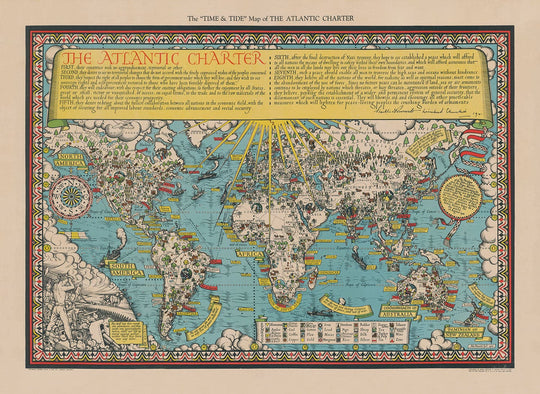 La Carta, que describe la visión de Roosevelt y Churchill para un mundo posterior a la Segunda Guerra Mundial, domina la parte superior del mapa.