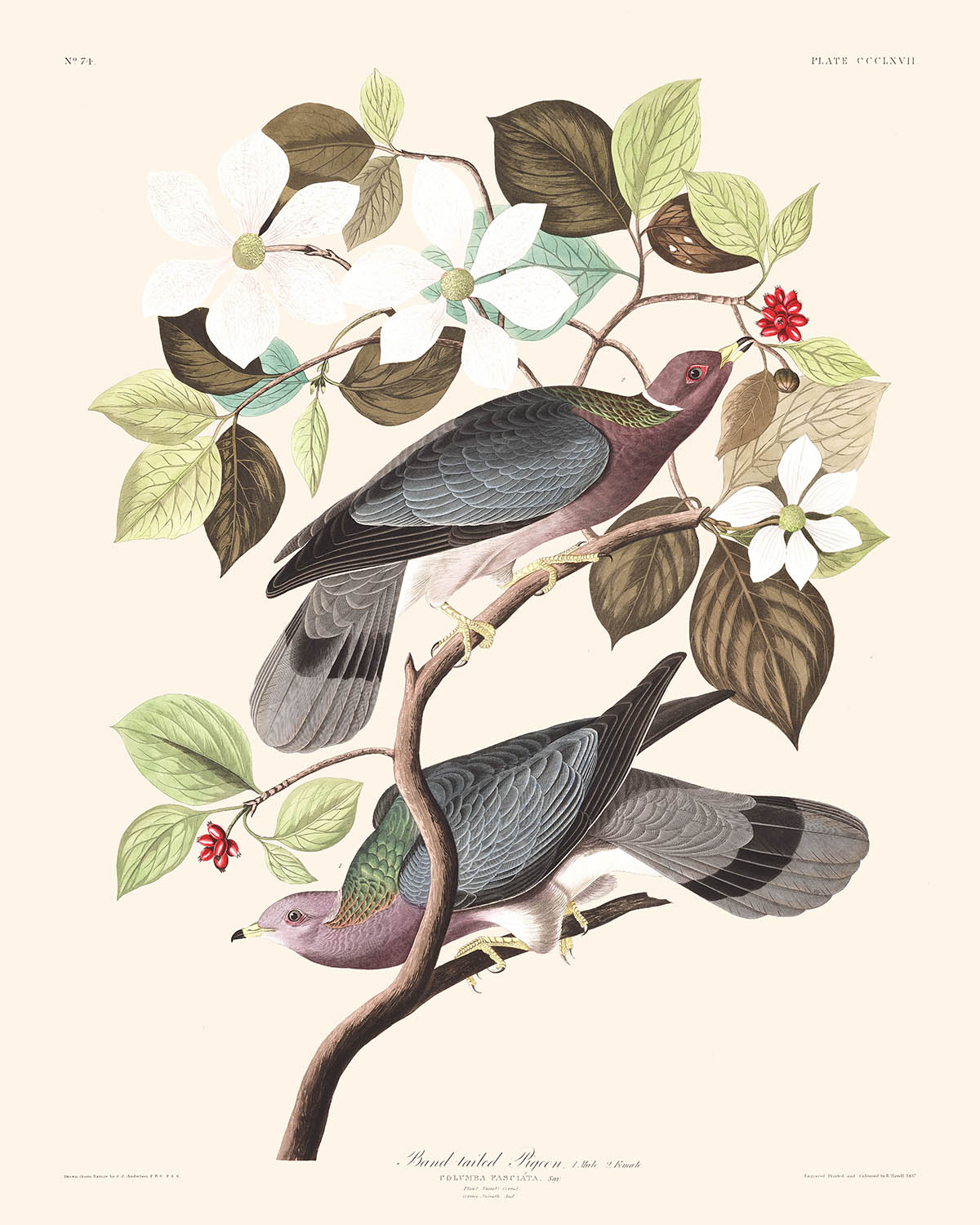 El uso del color en esta obra de arte es notable. Las palomas exhiben tonos de púrpura rojizo claro, azul grisáceo y verde metálico, con delicadas marcas y plumaje detallado. La composición, que presenta a las aves sobre una rama ilustrada artísticamente, crea una sensación de armonía y elegancia natural. La capacidad de Audubon para combinar precisión científica con belleza estética es lo que hace que su trabajo sea atemporal y atractivo.