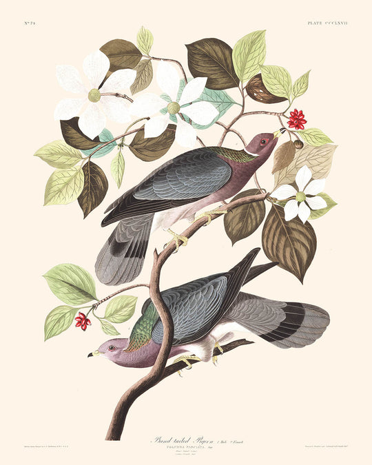 John James Audubon, un artista autodidacta y apasionado ornitólogo, es celebrado por sus profundas contribuciones a la ornitología a través de sus representaciones realistas de aves de América del Norte. Su trabajo en Las Aves de América fue pionero, proporcionando perspectivas inigualables sobre el mundo aviar. Esta ilustración particular de la paloma de cola de banda no solo es visualmente impresionante, sino también históricamente significativa, representando una especie de ave que fue meticulosamente estudiada durante las expediciones a las Montañas Rocosas y el río Columbia.