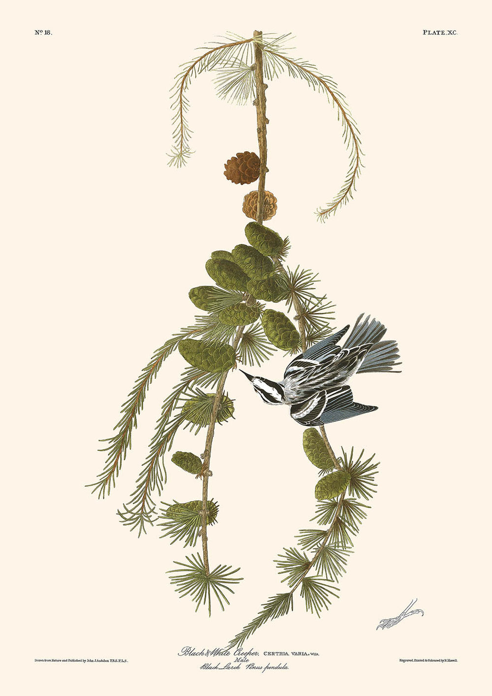 El Creeper Negro y Blanco en sí es fascinante por sus distintivos hábitos de escalada y su llamativo plumaje negro y blanco. Se puede encontrar en varias regiones, desde Luisiana hasta Canadá, y es conocido por su rápido movimiento a lo largo de los troncos y ramas de los árboles. La ilustración de Audubon captura al ave en movimiento, demostrando sus únicos comportamientos de alimentación y anidación.