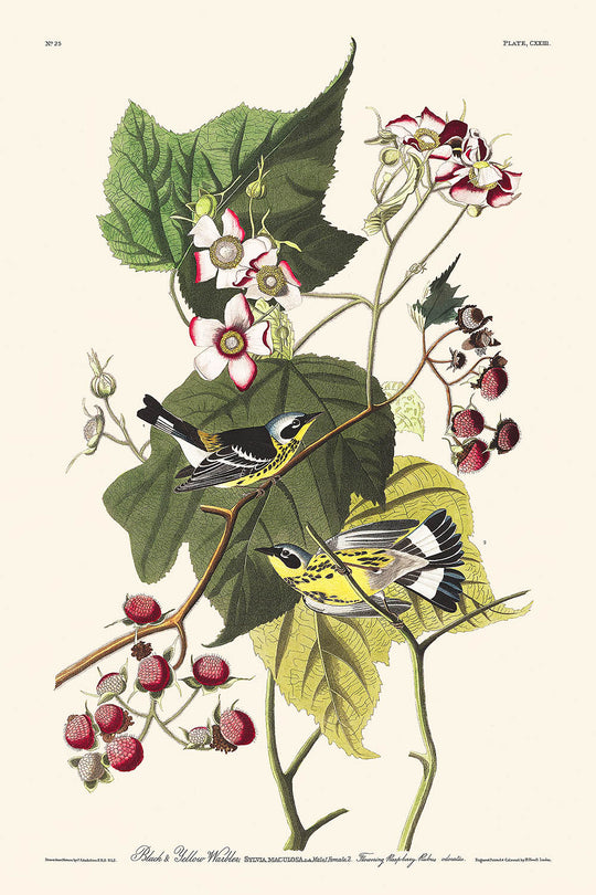"Reinitas Negras y Amarillas (Placa 123)" de John James Audubon, publicado por primera vez en 1827, es una ilustración asombrosamente detallada de la obra legendaria de Audubon, Las Aves de América. Esta cautivadora pieza captura a dos de las reinitas más animadas y bellamente plumadas.