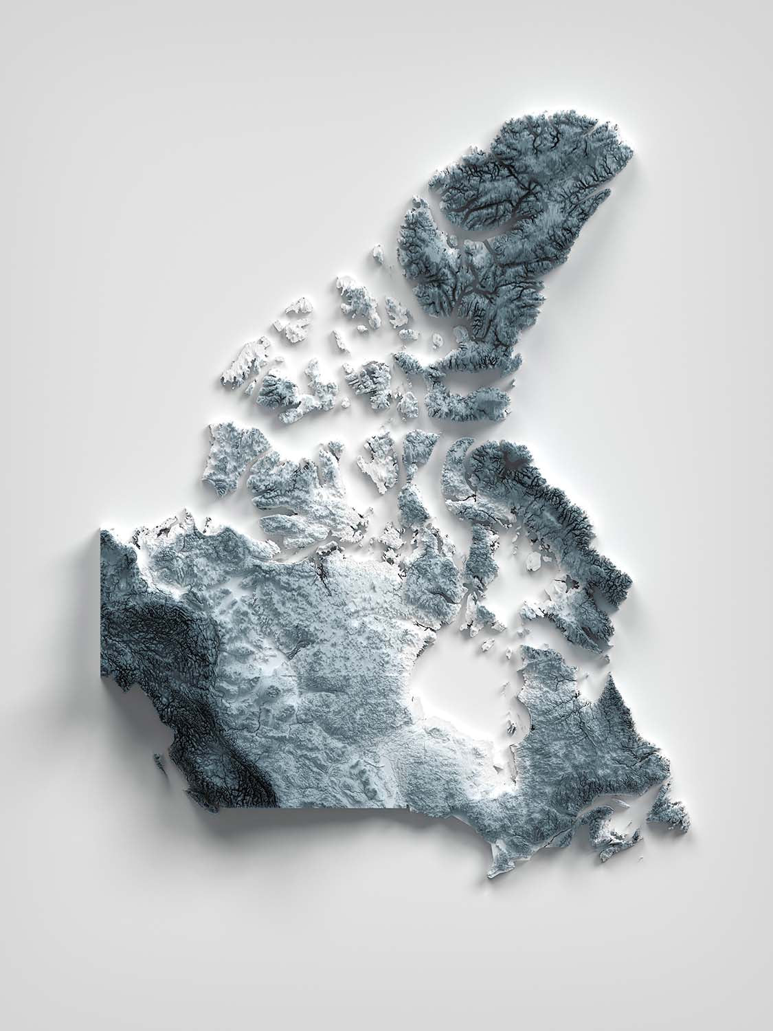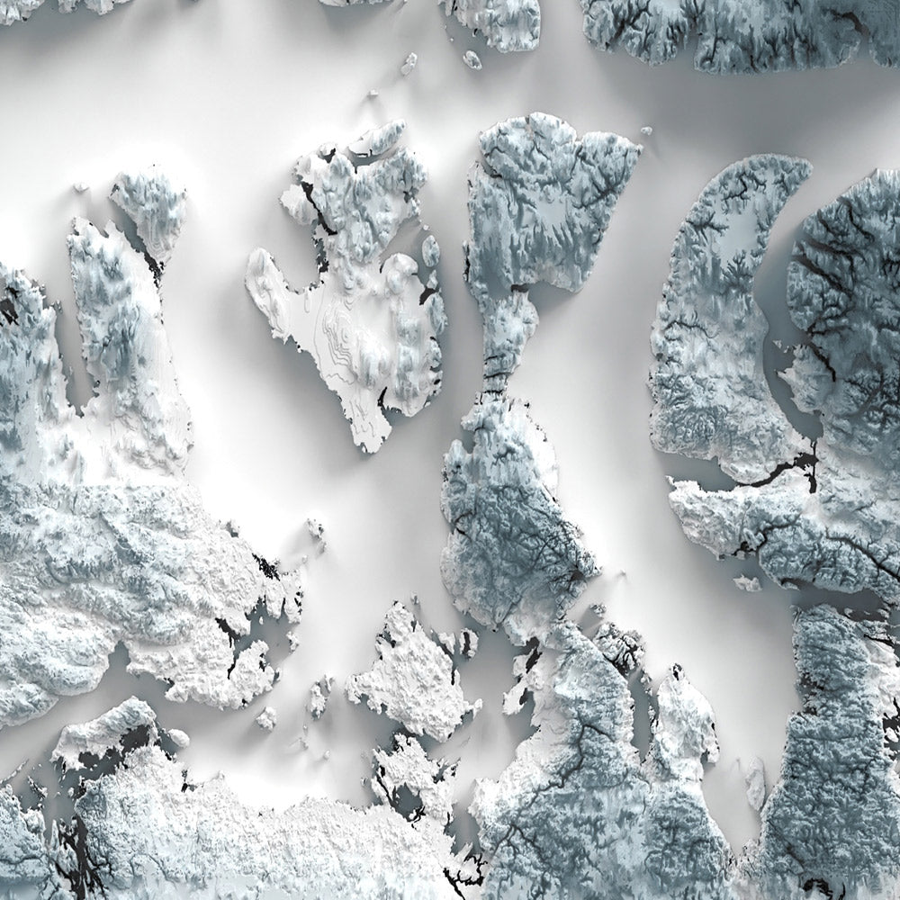 This is a minimalist topographical relief map of Canada, created by The Unique Maps Co. and enhanced with our trademarked Unique 3D process. There are no labels, no roads, and no towns—just the play of light and shadow bringing the country’s contours to life. Raking illumination heightens the highlands and deepens the lowlands, so the nation’s most dramatic peaks, broad plains, carved lakes, and intricate coastlines emerge with striking clarity.