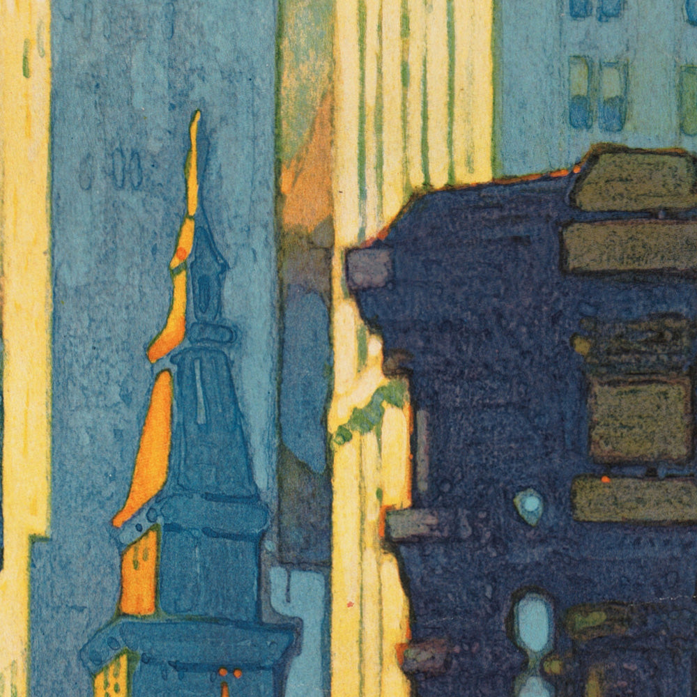 Ragan’s mastery of color and light sets the tone. The poster’s dominant blue establishes depth and cool clarity; layered greens suggest the reflective water and parks; and judicious touches of yellow add highlights that guide the eye and impart a warm, inviting glow. The streamlined geometry and careful gradients create a polished, cinematic atmosphere—an elegant focal point for an entryway, study, or living room. Owning this print means owning a piece of design history: a timeless expression of Chicago’s architectural poise and lakeside grandeur.