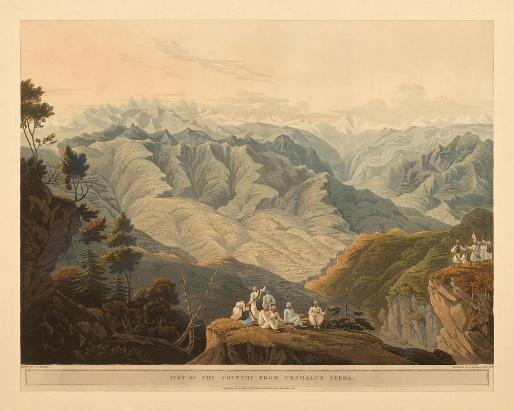 "Vista del país desde Urshalun Teeba" de Robert Havell y James Fraser, publicada por primera vez en 1820, es un testimonio de la imponente belleza y la intrigante historia de la región del Himalaya. Esta excepcional aguatinta antigua es una de las primeras interpretaciones que capturan las vistas observadas por los exploradores europeos en estas majestuosas montañas.