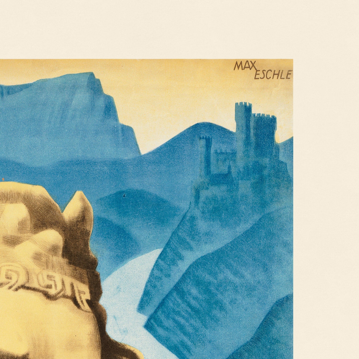 About the artist: Max Eschle was a German graphic artist active during the early to mid‑20th century, working for national and regional tourism boards. His posters are known for their theatrical compositions—monumental figures, emblematic landmarks, and clear, dignified typography—designed to be instantly legible on station platforms and city streets. Eschle favored airbrushed gradients and a restrained palette, devices that lent his work a polished, modern appeal.