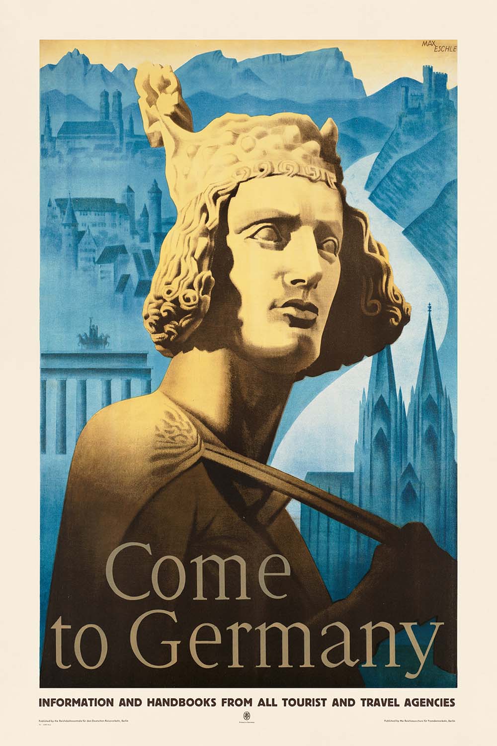 Come to Germany by Max Eschle is a classic European travel poster that invites visitors to discover Germany’s cities and landscapes. Likely created in the interwar years, it was produced for the national railway’s tourism office in Berlin and aimed at English‑speaking travelers—the invitation “Come to Germany” appears boldly across the lower third. Eschle sets a monumental golden statue of a medieval figure in the foreground, its sword cutting diagonally across the image, while a cool blue montage unfolds behind: the twin spires of a great Gothic cathedral, a sweep of river resembling the Rhine, the Brandenburg Gate’s columns, castle silhouettes, and distant Alpine ridges. The contrast of warm ochres against layered blues gives the scene both grandeur and serenity, perfectly capturing the romance of continental rail travel.