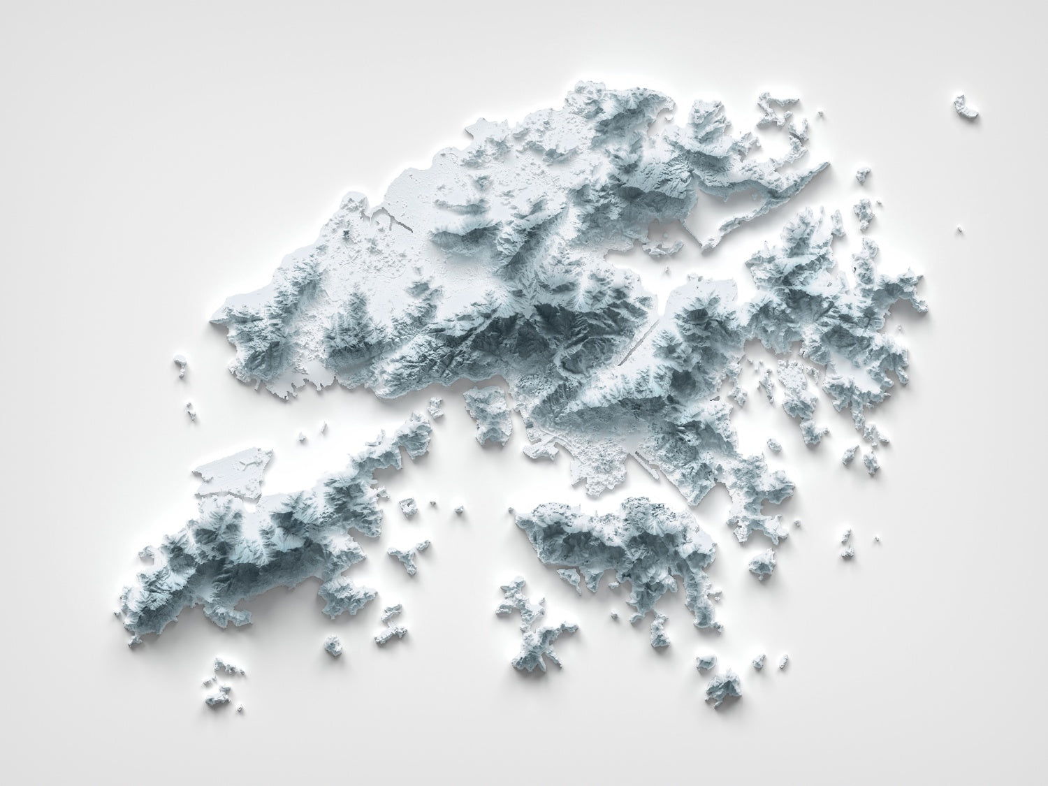 Outlying islands—Lamma, Cheung Chau, Peng Chau, Po Toi, and dozens more—dot the seascape as solitary domes and ridgelets. Each island’s relief is rendered by a crisp edge of light on windward slopes and fine, pooled shadow lee-side, a gentle reminder of ferries, fishing grounds, and the maritime life that binds the region together.