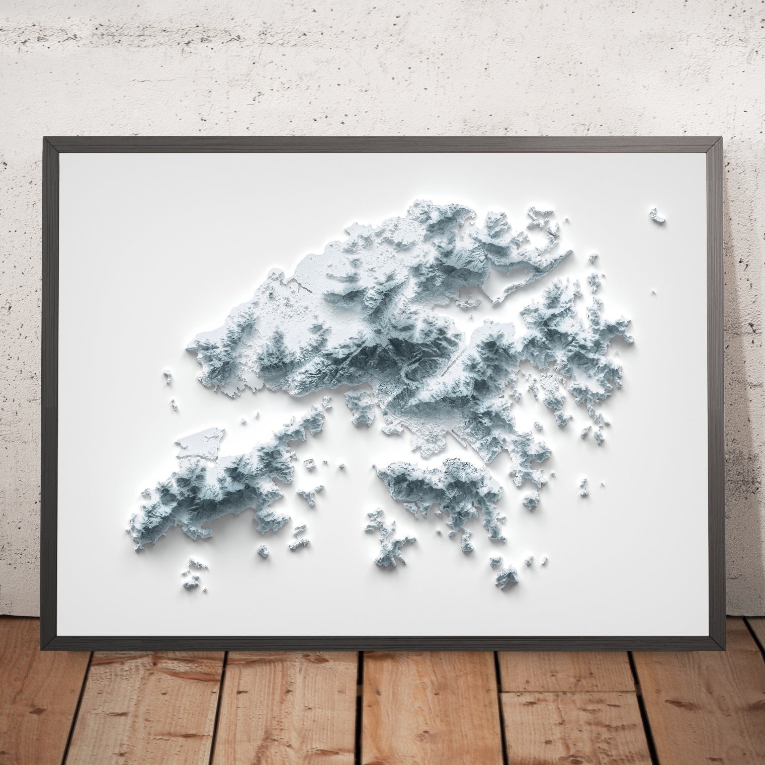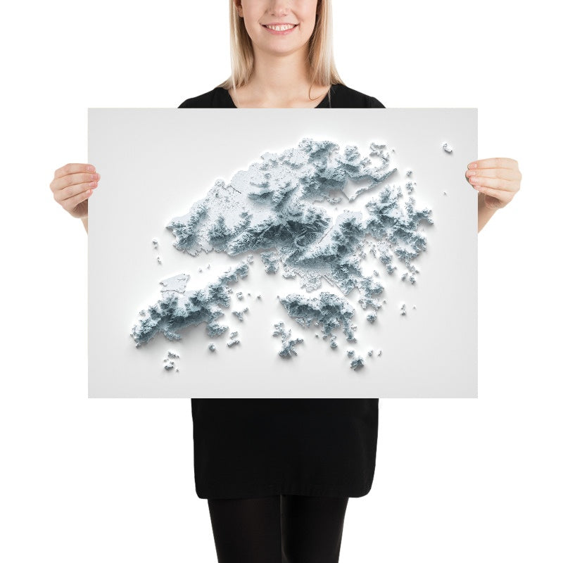 This is a minimalist topographical relief map of Hong Kong, created by The Unique Maps Co. and finished with our signature Unique 3D process. There are no labels, no roads, and no borders—just the land itself. Raking light grazes the uplands while shadows gather in ravines and harbour basins, so the city’s famous mountains, coves, and island-studded seas emerge with striking clarity.