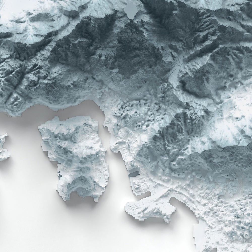 Our shaded relief prints use ultra high resolution topographic data and a secret 3D rendering process to create the illusion of raised terrain — like the mountains are about to lift right off the page. No labels, no borders, no distractions. Just the raw shape of the land, brought to life in a clean, modern style.