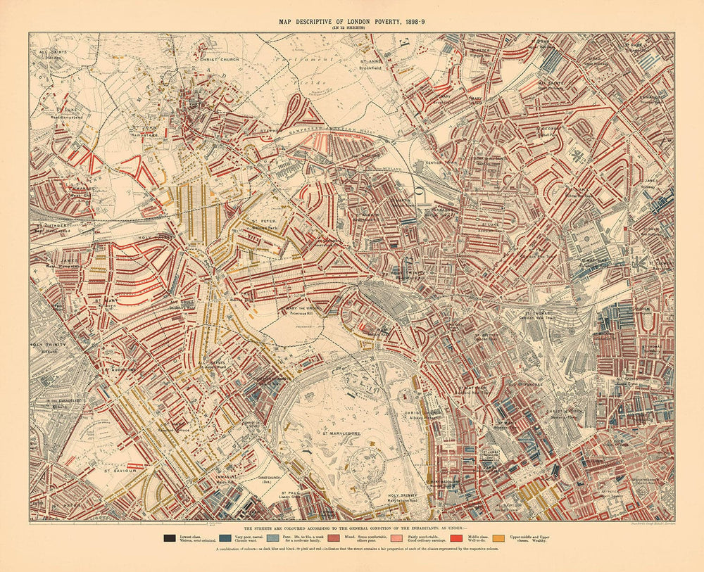 No sólo es un mapa increíblemente detallado de una gran parte del centro y las afueras de Londres, sino que Booth estudió la riqueza de cada casa y calle de Londres. Se puede ver qué partes de Londres eran de clase alta, de clase media o incluso "semicriminales" en el Londres victoriano.