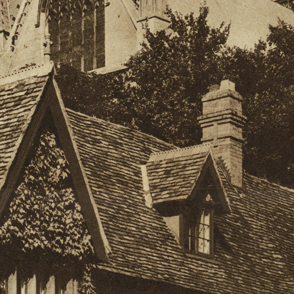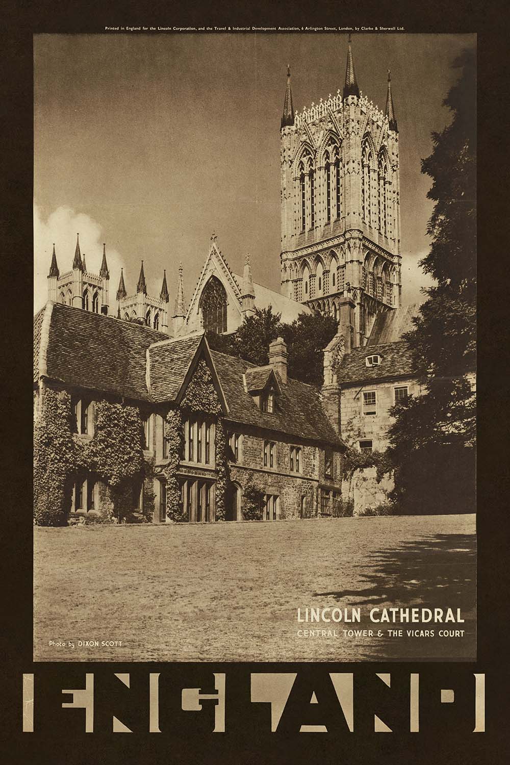 Lincoln Cathedral Central Tower & The Vicars Court – England by Dixon Scott captures one of Britain’s most storied Gothic landmarks in a quietly dramatic, sepia-toned study. Originally issued as a vintage travel poster, the piece celebrates the grandeur of Lincoln Cathedral’s central tower while anchoring the view with the intimate stone cottages and ivy-draped walls of the Vicars’ Court. The photograph’s early 20th-century sensibility—part documentary, part promotion—embodies a period when heritage sites were championed as touchstones of national memory and pride.