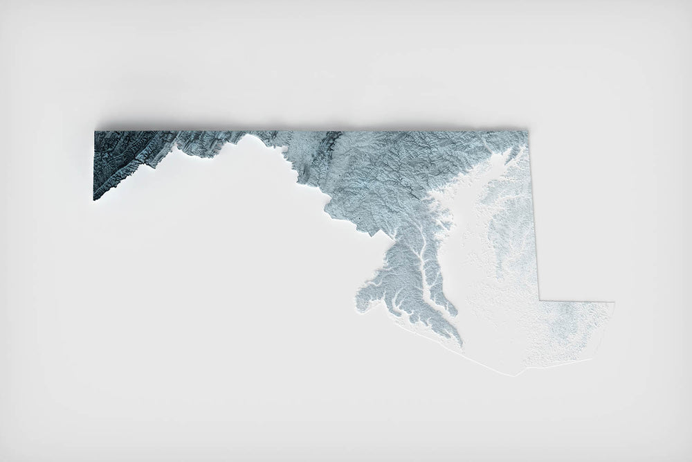 También notarás el intrincado contorno de la Península de Delmarva al este, con sus suaves extensiones separadas por arroyos de marea y pantanos. El efecto tridimensional del mapa muestra magistralmente el bullicioso corazón del estado alrededor de Baltimore y el área metropolitana, rodeado de tierras altas onduladas y bolsillos de bosque preservado.