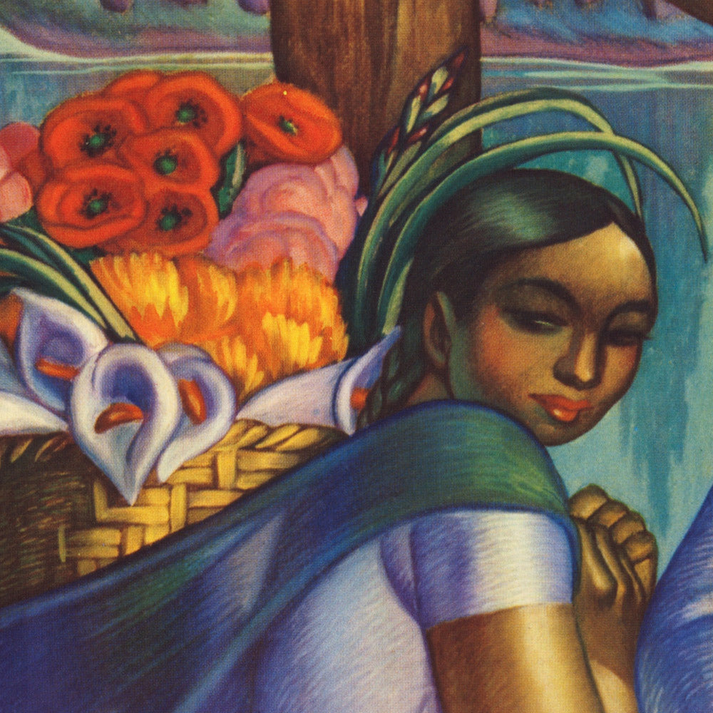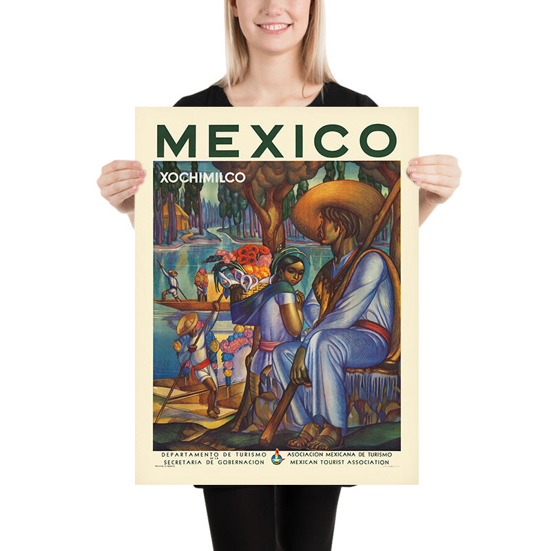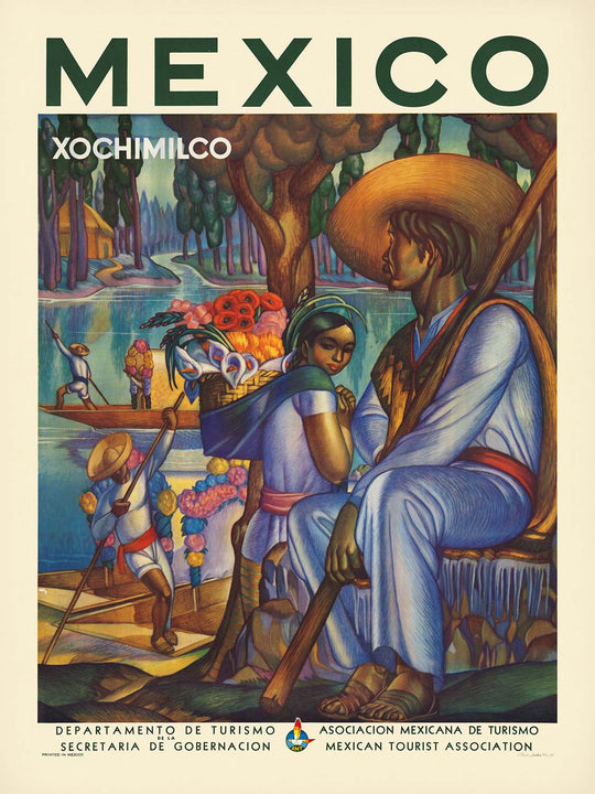 Xochimilco itself is a subject of enduring importance. Now recognized as a UNESCO World Heritage site, its network of canals and man-made garden islands symbolizes centuries of agricultural ingenuity and communal resilience. Travel posters such as this one framed Xochimilco not merely as a day trip from Mexico City, but as a living emblem of Mexican identity—where farming, markets, and music interlace on the water. The figures’ postures and expressions suggest pride in rural labor, while the composition invites viewers to step aboard and drift past flower-laden banks.