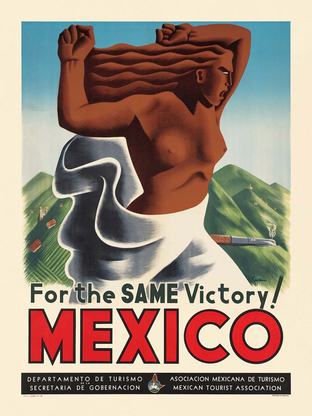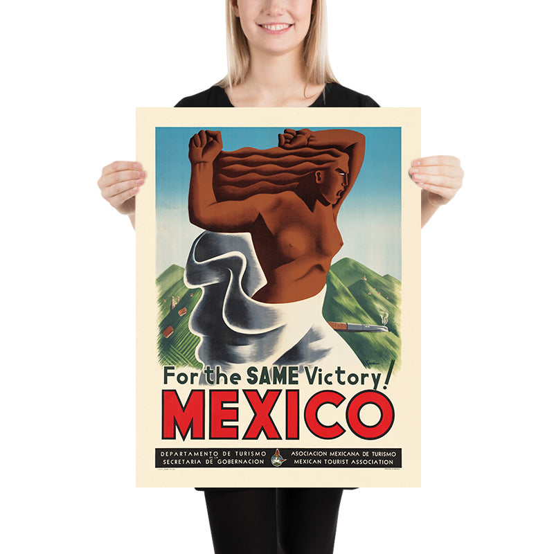 For the same victory! Mexico by an unknown artist is a stirring vintage poster from mid-century Mexico, created in the spirit of Mexican Muralism. The composition centers on a powerful, heroic figure set against stylized mountains and open sky, a visual language that championed cultural identity and the dignity of everyday people. With its rallying slogan and sweeping sense of place, the artwork evokes Mexico’s proud landscapes and the resilient spirit of its people, making it as compelling today as when it first appeared on city walls and travel kiosks.