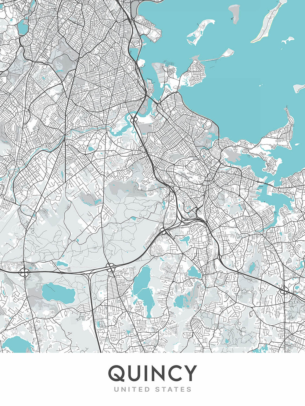 Mapa de la ciudad moderna de Quincy, MA: Parque Nacional Adams, Reserva Blue Hills, Cementerio, Mercado, Playa Wollaston