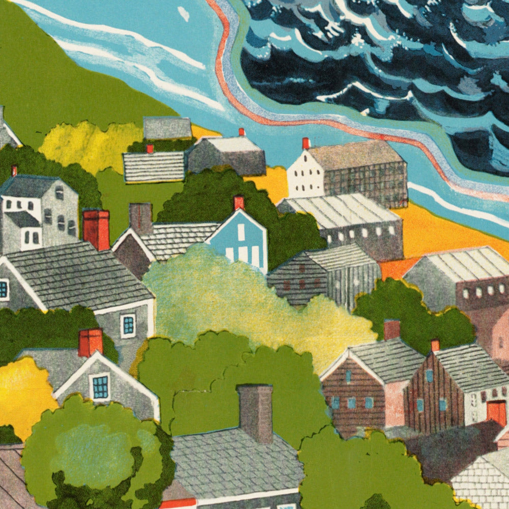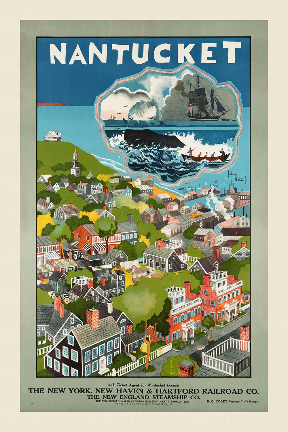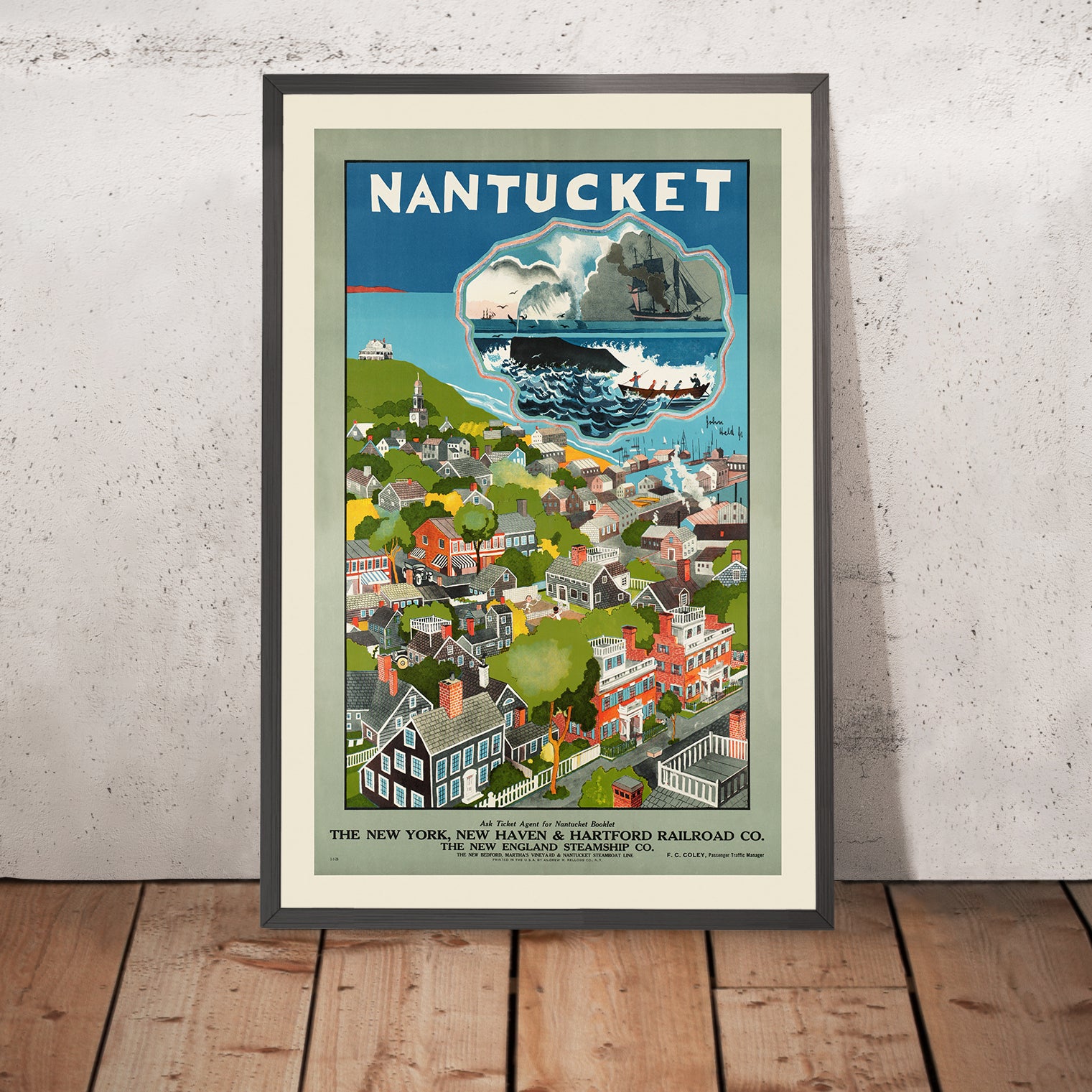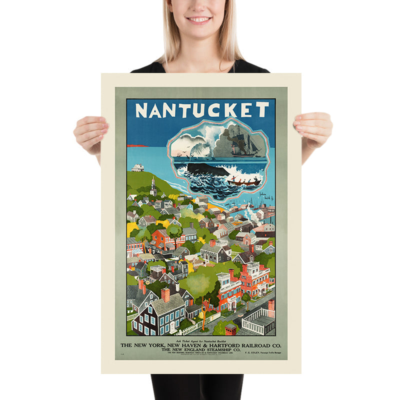 The subject itself is steeped in history. Nantucket—set off the coast of Massachusetts—grew from a whaling hub into a beloved retreat known for weathered shingles, harbor life, and luminous Atlantic horizons. Posters like this arose alongside the boom in American tourism, when improved rail and steamship links invited city-dwellers to seek sea air and summer light. As an artifact of that era, the image blends regional identity with the optimism of early modern travel.