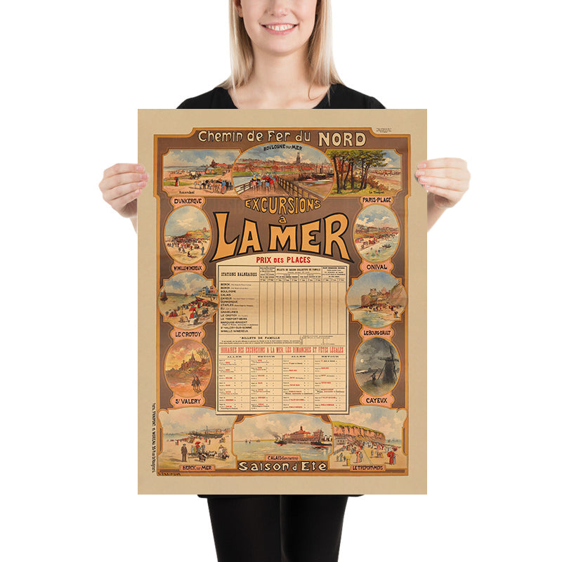 Chemin de fer du Nord. Excursions à la mer. Saison d’été by Gustave Fraipont (1890) captures the Belle Époque romance of seaside travel on France’s northern coast. Created for the Compagnie des Chemins de fer du Nord, this antique travel poster promotes summer journeys “à la mer” with Fraipont’s refined blend of illustration and typography. A celebrated painter, illustrator, and poster artist born in Belgium and later naturalized in France, Fraipont distilled the new leisure culture of rail travel into scenes and lettering that feel both elegant and inviting. Here, a sun‑washed palette and period type evoke the soft warmth of a day trip to the coast; the composition is rendered almost entirely in sepia-browns, beiges, and honeyed yellows, giving the seaside scene a nostalgic, sun‑bleached glow.