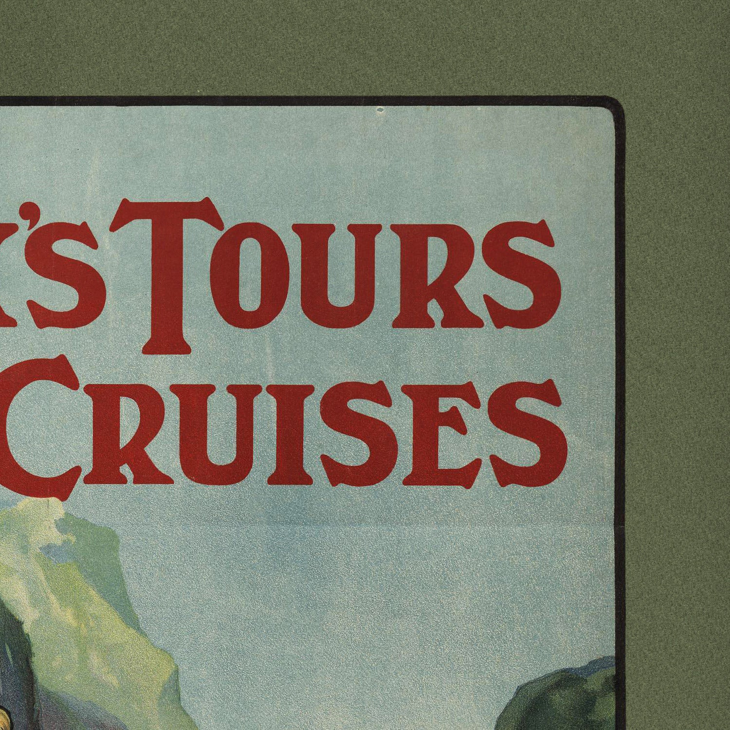 Norway’s fjords were a signature destination for Thomas Cook in this period, with cruises drawing travelers to steep-sided channels, cascading waterfalls, and long summer light. This poster’s focus on the fjord landscape speaks directly to the experience of slow travel by sea: gliding past emerald slopes, village hamlets tucked along the shoreline, and dramatic peaks that shift color with the weather.
