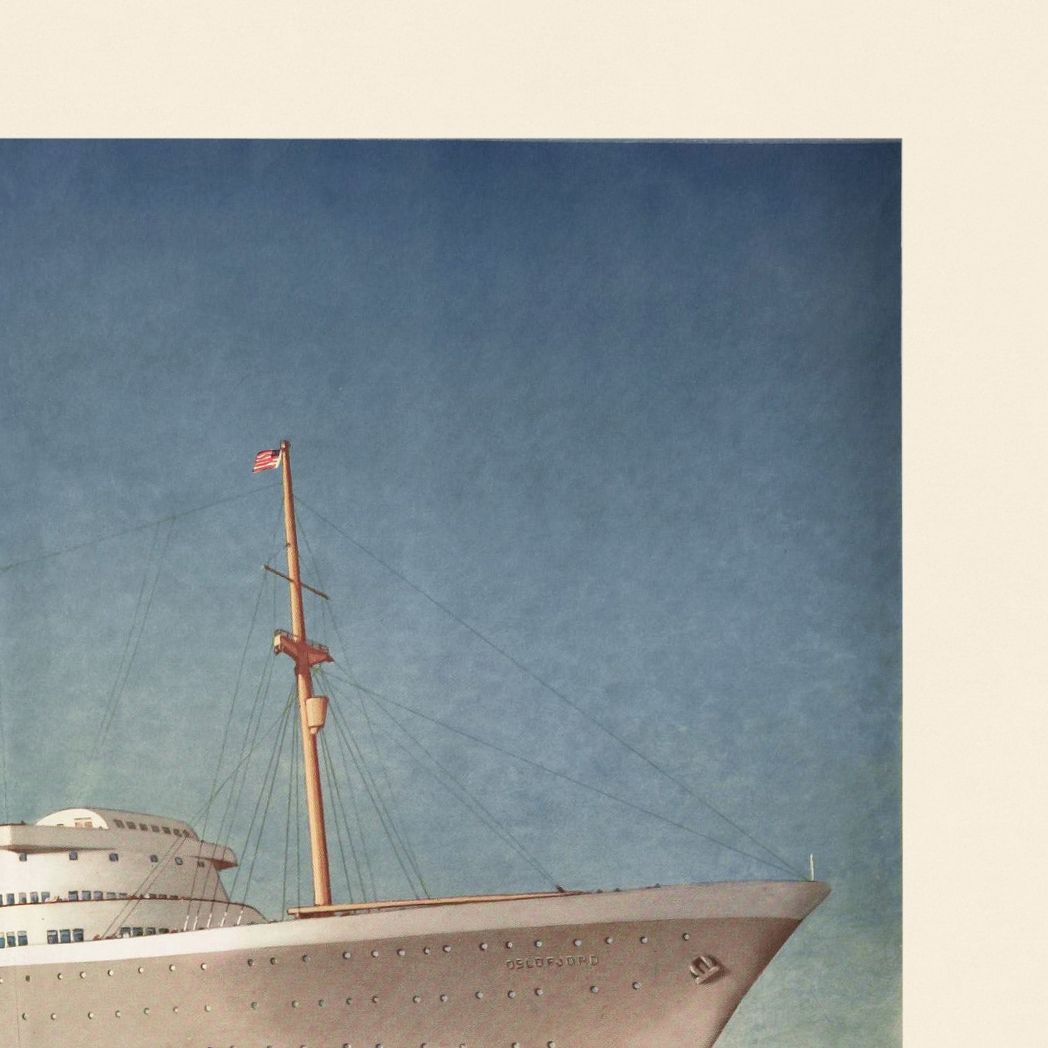 Visually, the design works through bold geometry and a pared-back palette—deep navy, bright white, and decisive red—that reads beautifully in contemporary interiors. The stark prow and upward thrust create a dynamic vertical line, while the softly graded sky lends air and space, preventing the composition from feeling heavy. Minimal text and clean letterforms give the image room to breathe, making it an effortless statement piece for modern, coastal, or Scandinavian-inspired rooms—and a perfect companion to vintage travel or maritime collections.