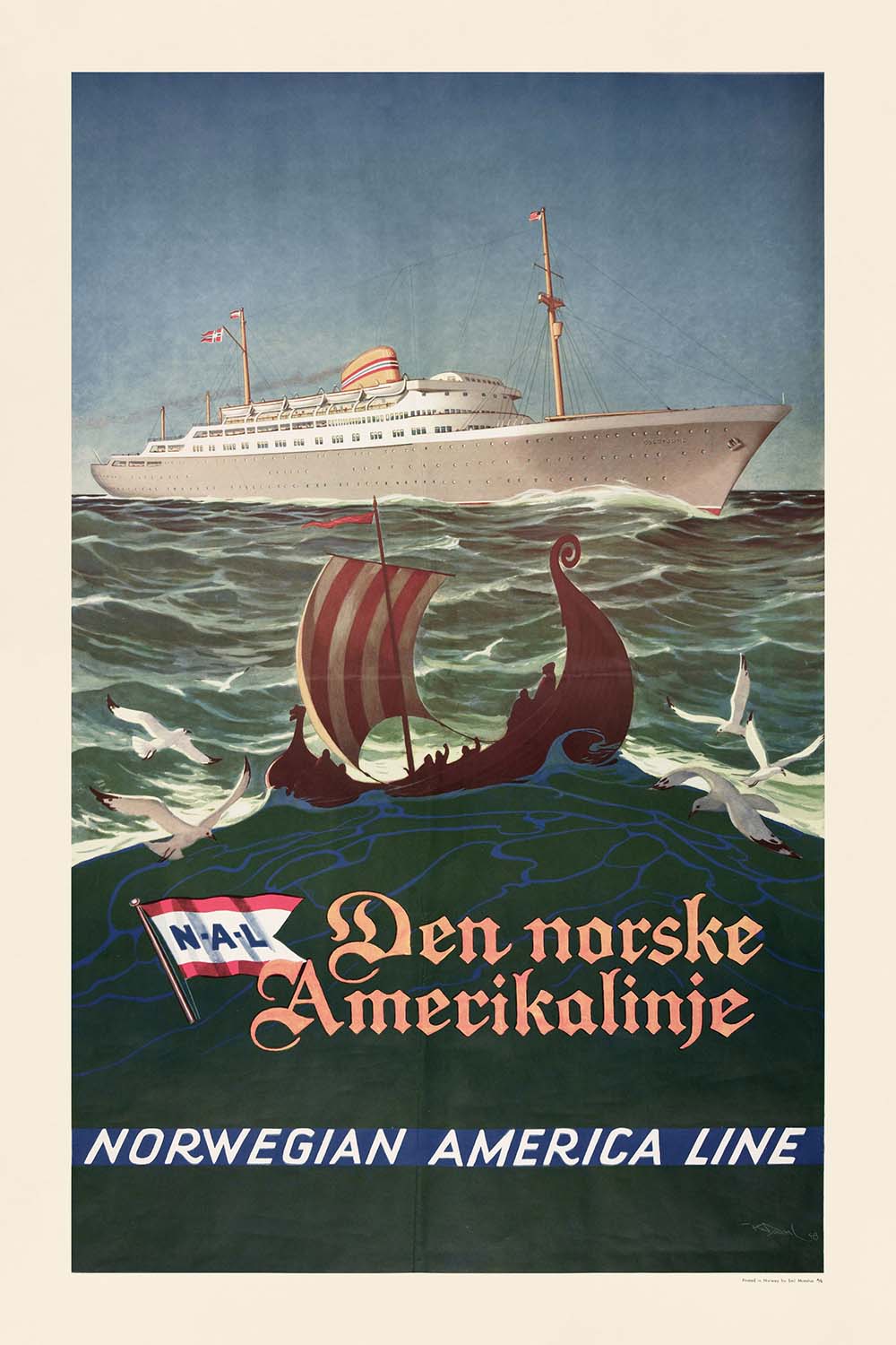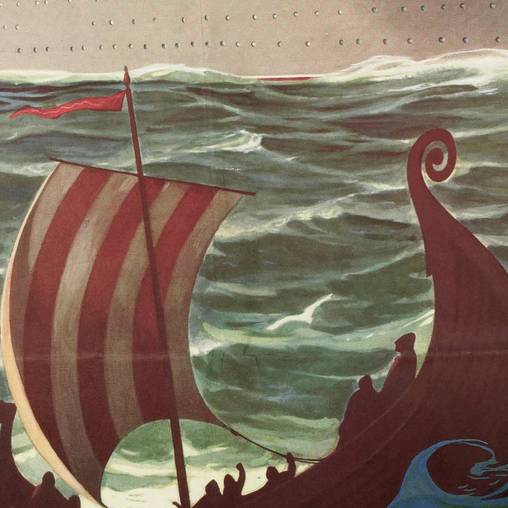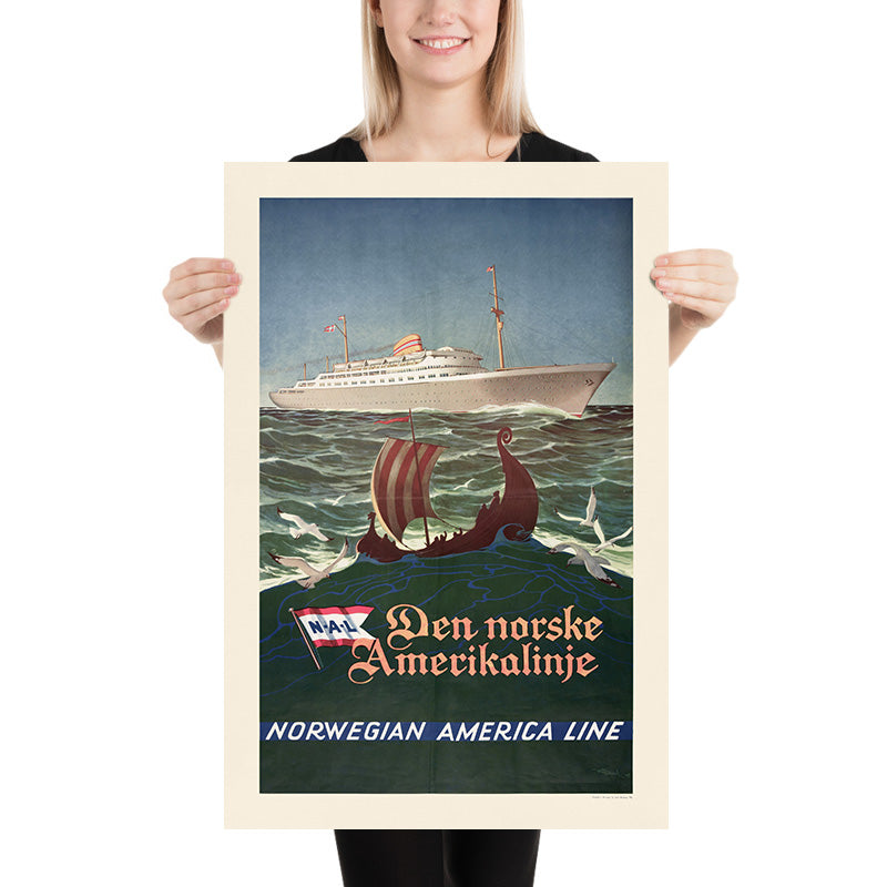 The Norwegian America Line (Den Norske Amerikalinje) connected cities such as Oslo and Bergen with New York and other East Coast ports, carrying emigrants, tourists, mail, and cargo across the North Atlantic. By 1948, after the disruptions of the Second World War, transatlantic travel was reclaiming its glamour. Posters like this one promoted not only a route but a promise—swift, dignified passage between continents, with Norway’s maritime tradition at its heart. Displaying the piece is a nod to that era of ocean-going adventure and the cultural bridge it formed between Scandinavia and America.