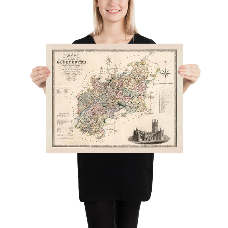 Map of the County of Gloucester, engraved by Christopher Greenwood in 1831 and issued by J. S. Virtue, presents Gloucestershire with a consummate blend of precision and poise. Executed as a finely engraved, hand-colored production, it aligns with Greenwood’s characteristic early nineteenth-century aesthetic: an elegant title cartouche, ornamental border work, and a poised compass rose turning north to the upper right. Relief is rendered by lucid hachures that catch the eye like light on folded cloth, animating the county’s slopes and vales. An engraved prospect of Gloucester Cathedral enriches the composition, anchoring the geography in stone and story. The whole coheres as both document and artwork, a county-scale portrait whose exacting line, restrained palette, and crisp lettering speak to the era’s highest cartographic standards.