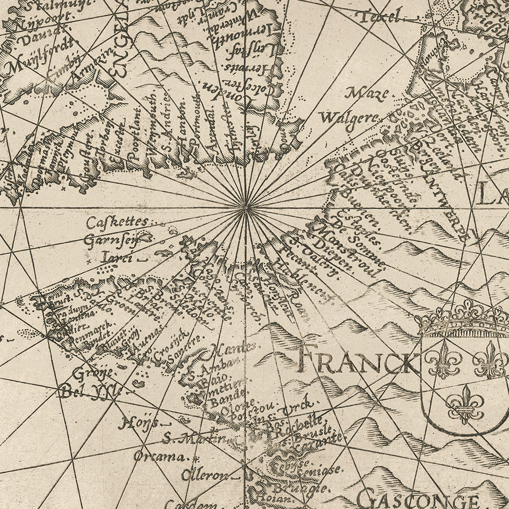 The chart distills the practice of Lucas Janszoon Waghenaer, the Enkhuizen-born sailor-cartographer who served at sea from 1550 to 1579 and transformed that experience into the first engraved sea atlas. His mariner’s perspective is matched by the virtuoso engraving of Joannes Doetecum, whose crisp linework, shaded ornament, and finely cut lettering yield both precision and grace. This Dutch pilotage style—ornate yet exacting—set a template for generations of sea atlases, balancing navigational legibility with emblematic flourish. The result is a sweeping, coherent view of Europe’s maritime theater, enabling long-range route planning while rewarding close inspection of every bay, bar, and bend of coast.