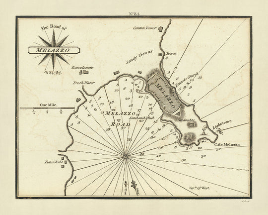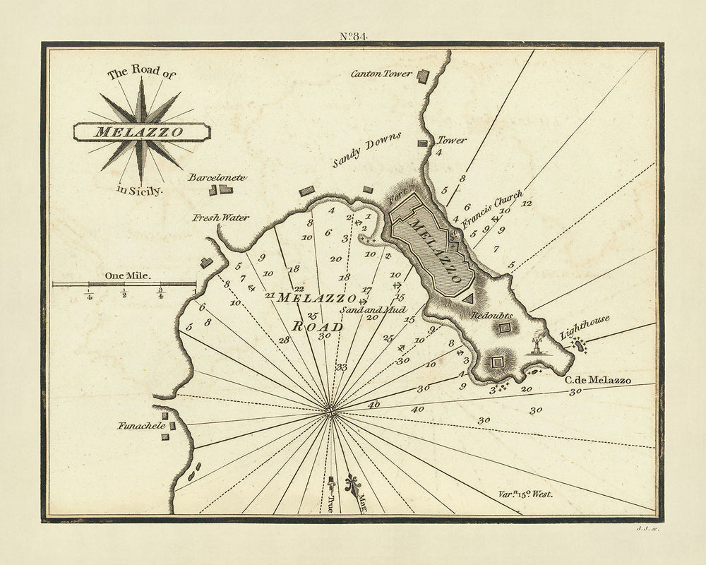 Más allá de su utilidad náutica, el mapa sirve como una instantánea cultural e histórica de la región durante principios de 1800. Ilustra monumentos significativos como las fortificaciones de Melazzo, la icónica Iglesia de San Francisco y el faro de importancia estratégica. Estas características no solo ayudan en la navegación, sino que también reflejan la importancia histórica de Melazzo como un puesto marítimo fortificado. La representación de caminos y asentamientos como Barcellona Pozzo di Gotto conecta el paisaje marítimo con la vida terrestre, uniendo mar y tierra.