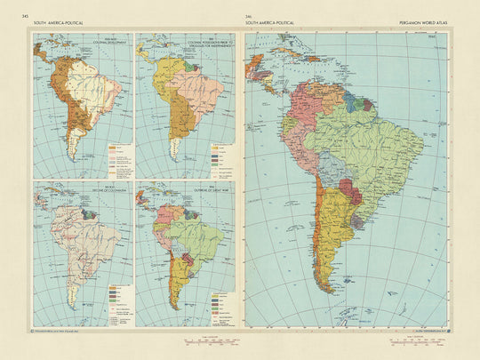 - Cinco mapas en inserto muestran el desarrollo colonial de América del Sur desde 1500 hasta 1600, las posesiones coloniales antes de las luchas por la independencia en 1810, el declive del colonialismo de 1811 a 1830, el estallido de la Gran Guerra en 1914 y los condados actuales en 1966.