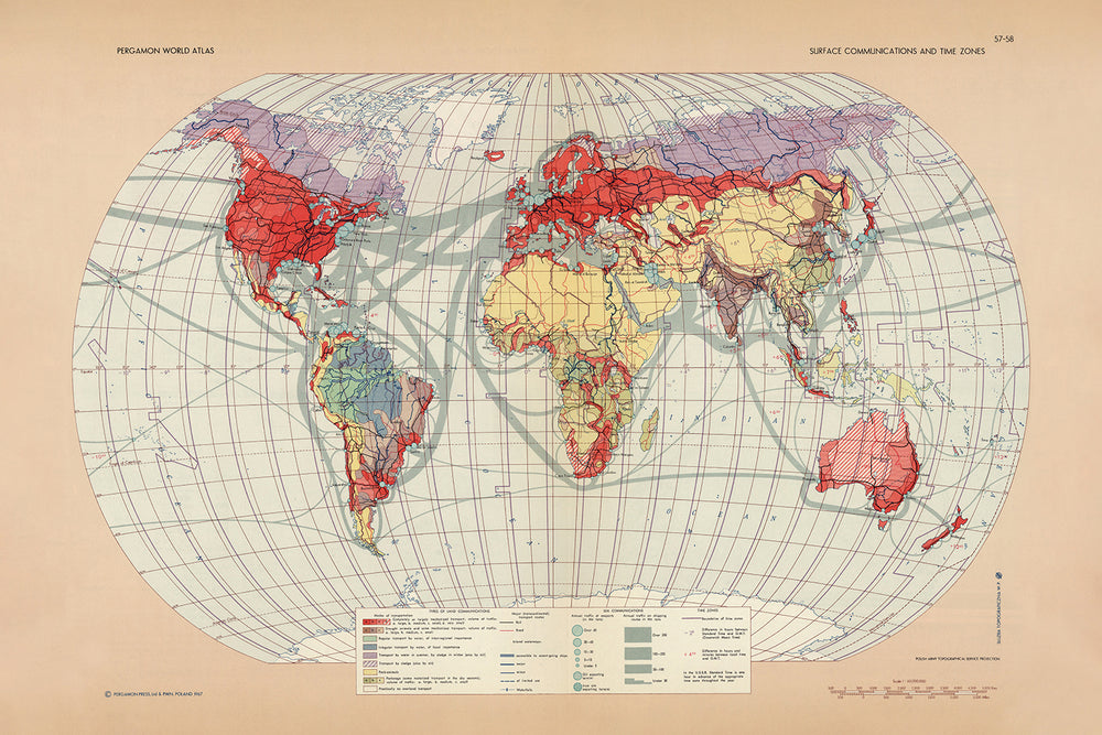 Este mapa mundial de 1967, publicado por el Servicio de Topografía del Ejército Polaco, es una mirada fascinante a las comunicaciones de superficie y zonas horarias del mundo durante la Guerra Fría. El mapa está centrado en el Meridiano de Greenwich, con las Américas a la izquierda y Europa, África y Asia a la derecha. Muestra una gran cantidad de información sobre rutas de envío, rutas aéreas y las ubicaciones de las principales ciudades, puertos y aeropuertos. El mapa también incluye varias infografías que proporcionan información adicional sobre las comunicaciones de superficie y zonas horarias del mundo.