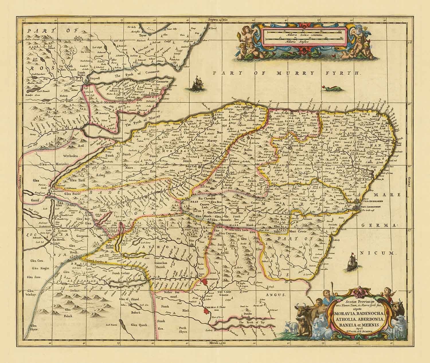Esta mapa detallado, coloreado a mano y extremadamente raro de Inverness, Moray y Aberdeenshire fue publicado originalmente en 1690 por Valk & Schenk, un dúo maestro de cartografía que trabajó en Ámsterdam en el siglo XVII.