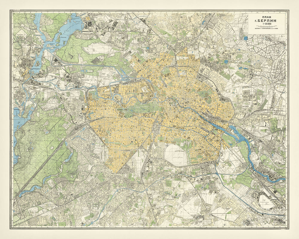 El "План г. Берлин 1:25000" (Plan de Berlín 1:25000) es un mapa de gran importancia histórica, meticulosamente elaborado por la Unidad de Mapeo Militar de Leningrado en 1945. Este mapa, conocido como "El Mapa de la Victoria", jugó un papel crucial durante la Batalla de Berlín, guiando a las tropas soviéticas a través del complejo paisaje urbano de la ciudad. El mapa abarca desde el Lago Tegeler hasta Neukölln, cubriendo un área de diez por veinte millas, y ofrece un nivel de detalle sin igual que fue crucial para las maniobras estratégicas del Ejército Rojo durante las etapas finales de la Segunda Guerra Mundial.