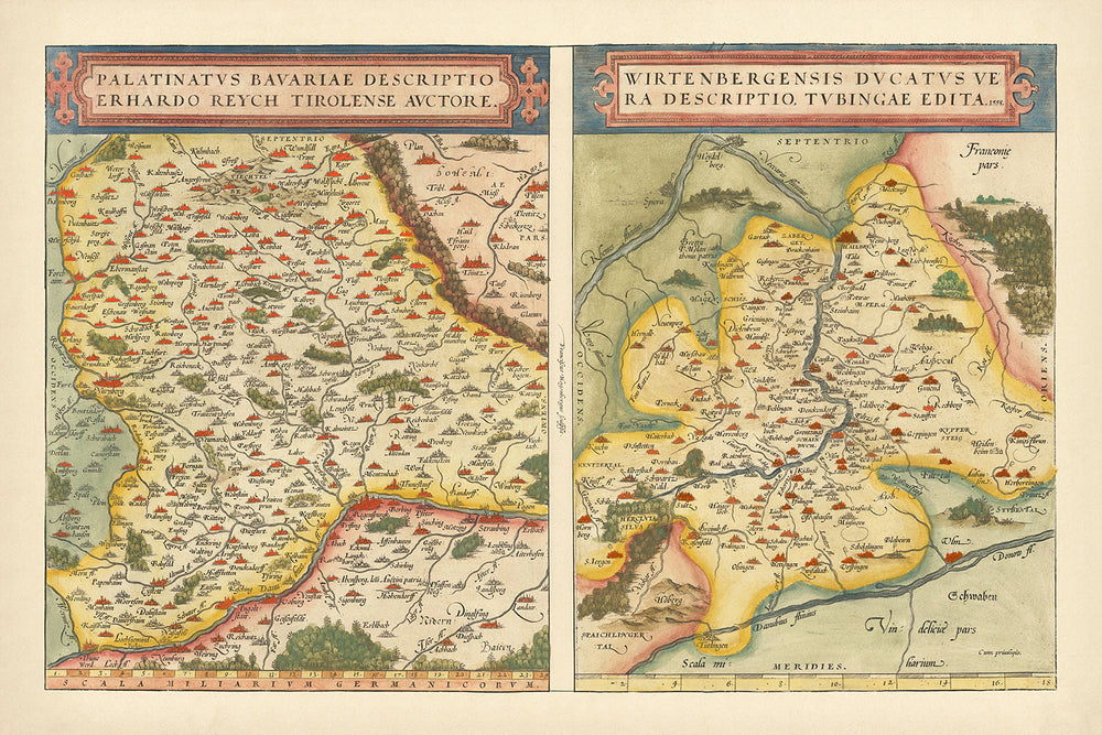 - Basado en mapas anteriores: El mapa de Baviera se basa en un mapa de 1540 de Erhart Reich, y el mapa de Wurtemberg incorpora cartografía de un mapa de 1559 publicado en Tubingen.