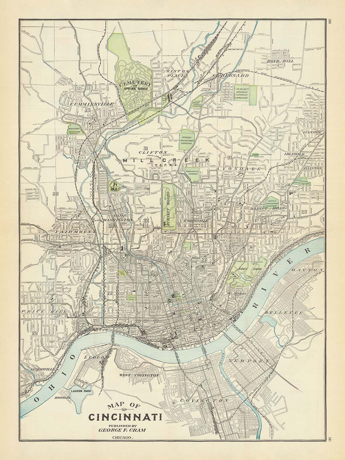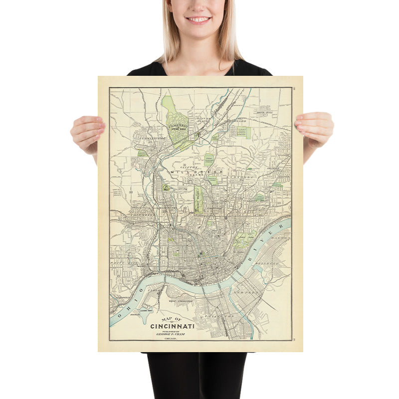 Map of Cincinnati, engraved by George F. Cram in 1911, captures the Queen City at a moment when civic ambition and transportation powerfully shaped its streets and skyline. This detailed city plan delineates the Ohio River’s commanding sweep, a web of train lines, and the full hierarchy of streets and public places with Cram’s hallmark clarity. A decorative cartouche and nuanced color coding organize neighborhoods and municipal features at a glance, while fine annotations guide the eye through the city’s dense core and expanding periphery. As a city map, it is especially notable for revealing how Cincinnati’s riverfront commerce, industrial corridors, and civic institutions knit together—an urban portrait poised between 19th‑century industry and 20th‑century modernization.