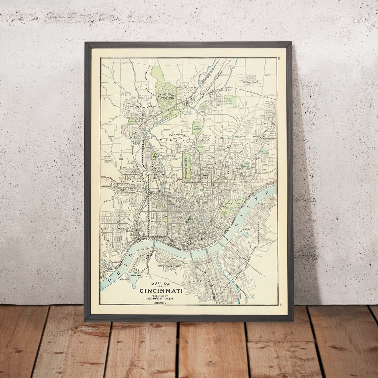 George F. Cram was among America’s foremost mapmakers of the late 19th and early 20th centuries, celebrated for meticulous production and refined visual logic. This 1911 city plan exemplifies his mature style: authoritative detail tempered by a decorative cartouche and disciplined palettes that guide without distracting. For historians and collectors alike, it offers an incisive lens on population growth, civic planning, and the evolution of transportation before the age of expressways. It preserves the street names that anchor family histories, the rail lines that powered industry, and the municipal boundaries that tell the story of annexation and aspiration. Cram’s Cincinnati is both precise reference and cultural artifact—an urbane, enduring statement of a city in full stride.