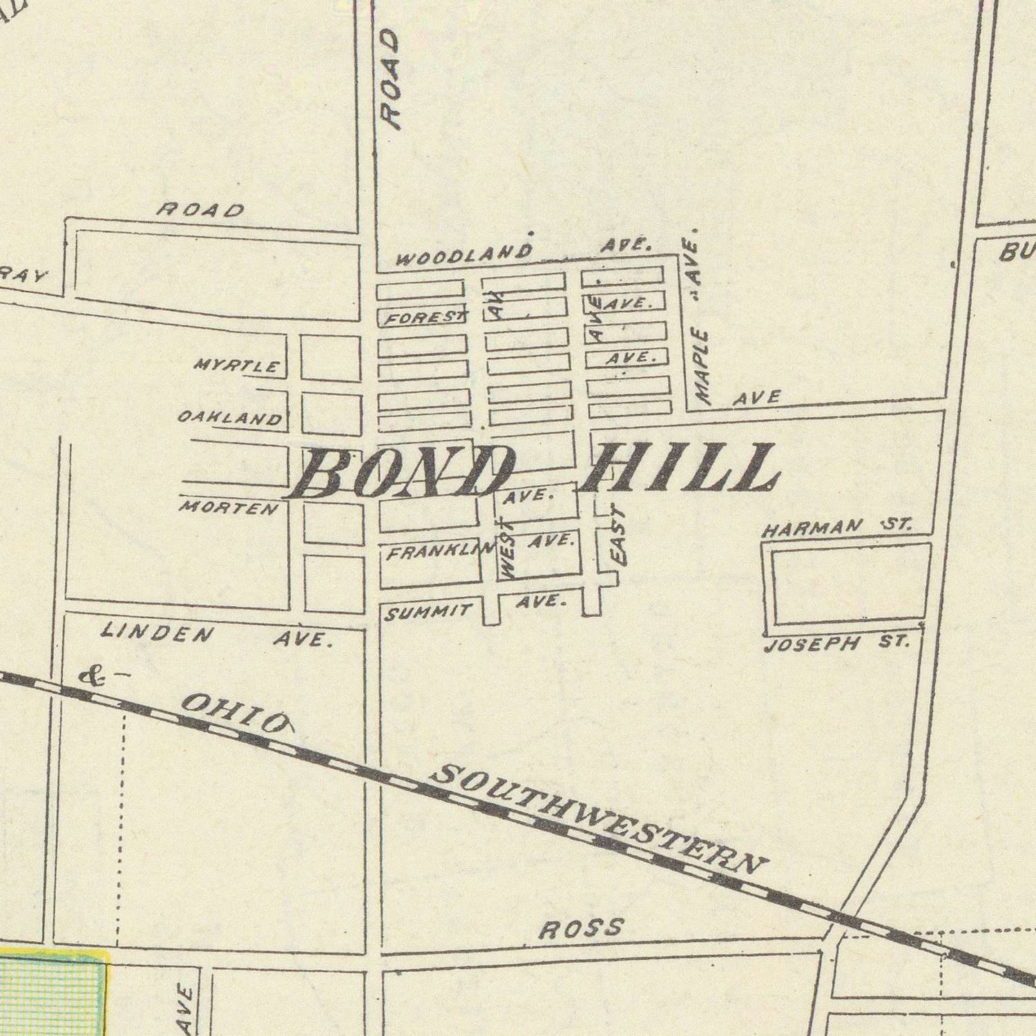 Transportation threads through the plan with commanding influence. Rail lines lace the riverfront and the Mill Creek corridor, converging near Western and Central Avenues, while arterial roads radiate to the hills: Reading Road, Madison and Montgomery Roads to the east; Clifton Avenue toward the university heights; Harrison and Glenway Avenues spanning the western terraces; Winton Road and North Bend Road reaching the northwestern neighborhoods; Blue Rock Road marking the approach to river-valley communities. College Hill Avenue and Clifton Avenue signal the incorporation of formerly outlying suburbs, and clear city boundaries document Cincinnati’s expanding jurisdiction. In its aggregate, the map shows how steel rails and macadamized roads anchored neighborhoods to the urban core, binding commerce, labor, and daily life.