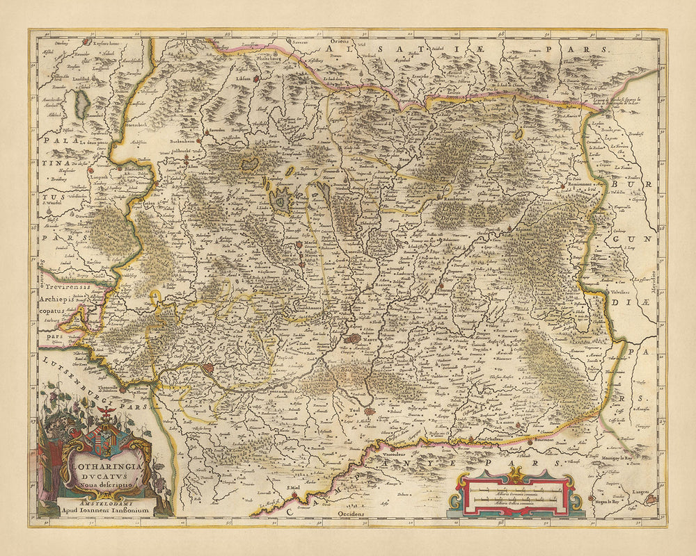 La 'Lotharingia Ducatus Nova descriptio' no es sólo una representación de los centros urbanos. También retrata maravillosamente el paisaje natural de la región. Destaca el Parque Natural Regional de los Vosgos del Norte, un importante monumento natural. La representación detallada del mapa de bosques, vías fluviales, canales y montañas proporciona una imagen vívida del diverso terreno de la región. La inclusión de fortificaciones y puntos de referencia realza aún más el valor histórico del mapa, arrojando luz sobre la importancia estratégica de la región durante el período.