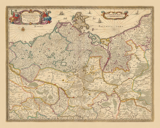 Más allá de estas ciudades, el mapa también ofrece una visión general de las divisiones políticas dentro del electorado de Brandeburgo, Mecklemburgo y la mayor parte de Pomerania. Las fronteras y territorios están claramente demarcados, lo que ofrece una visión fascinante del clima político de la época. Este mapa sirve como una ventana al pasado, permitiendo al espectador comprender las complejidades de la política regional durante una época de grandes cambios y desarrollo en Europa.