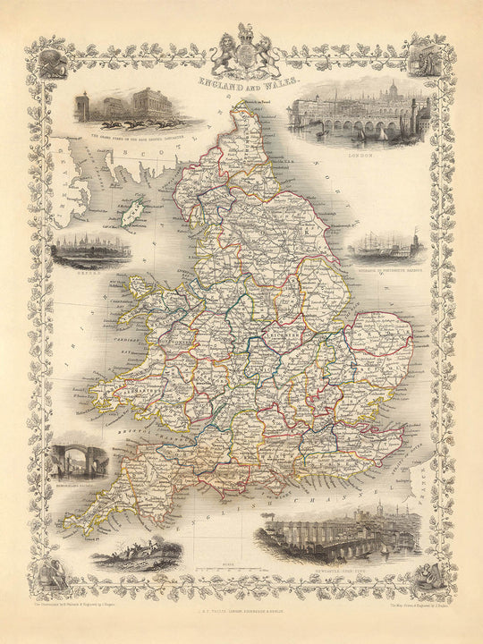 John Tallis, el cerebro detrás de este mapa, fue célebre por su capacidad para combinar precisión con belleza. Sus obras se distinguen por sus cenefas decorativas y grabados detallados, lo que las hace muy buscadas tanto por coleccionistas como por historiadores. Este mapa no es una excepción, ya que presenta el Sello Real en la parte superior y dibujos simbólicos que representan las artes, las ciencias, la agricultura y el transporte marítimo. Estos elementos no sólo realzan el atractivo estético del mapa, sino que también permiten vislumbrar el entorno cultural y económico de la Inglaterra y Gales de la década de 1850.