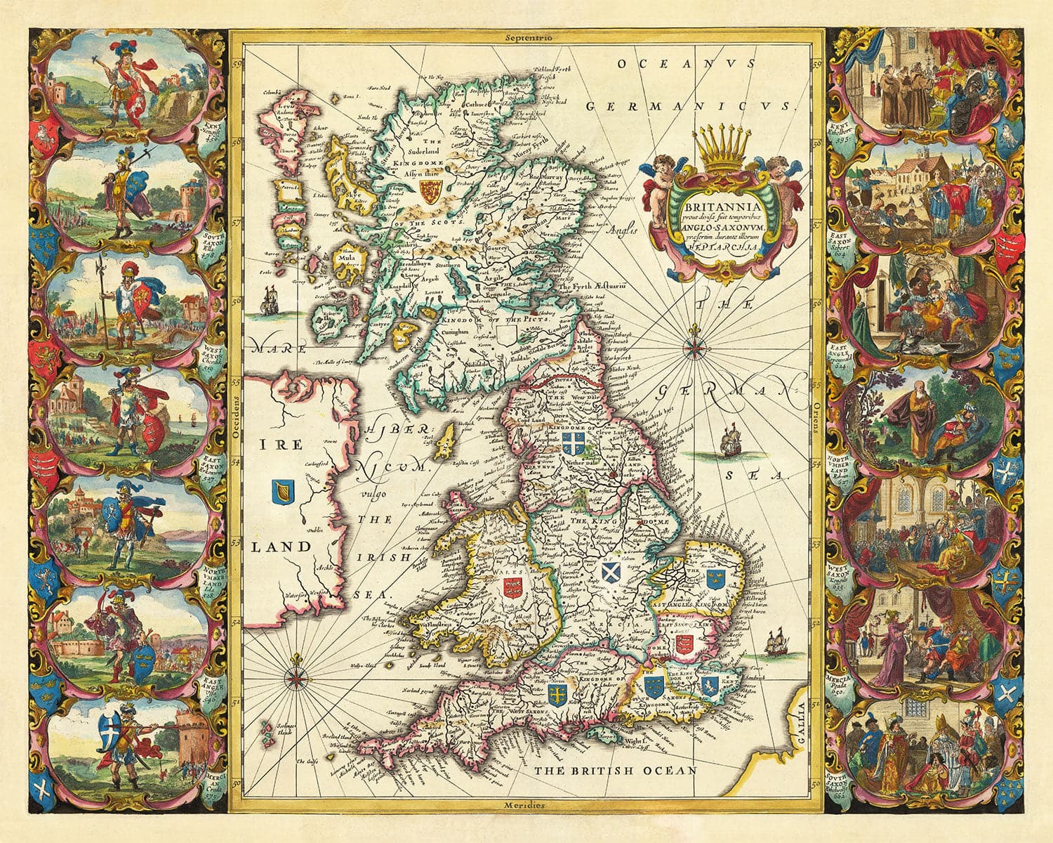 Antigua mapa vikingo de Gran Bretaña en 1645 por Jan Jansson: Heptarquía anglosajona en Inglaterra, Escocia y Gales