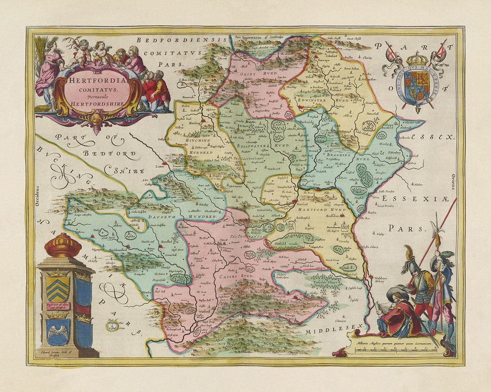 Muchos de los pueblos, aldeas y ciudades de Hertfordshire ya son visibles en este antiguo mapa, como Hertford, Watford y St Albans.