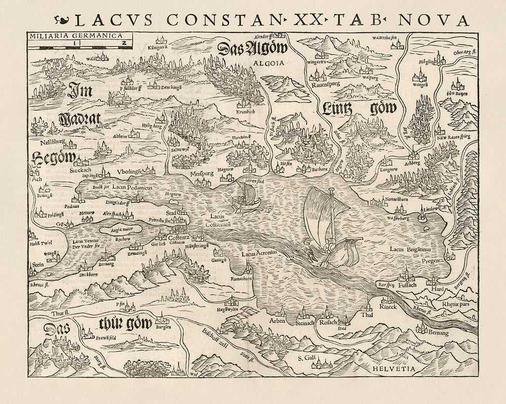 The map’s artistry is matched only by its detail. The uncolored woodcut design, rendered in the ornate Holbein style, brings to life the region’s physical and political landscape. Lake Constance dominates the composition, its surface animated by elegant illustrations of sailing vessels, while rivers meander through forests and valleys, and mountain ranges are depicted with expressive, pictorial relief. The map’s borders are carefully delineated, hinting at the evolving political boundaries of the era and the strategic importance of this transnational region.