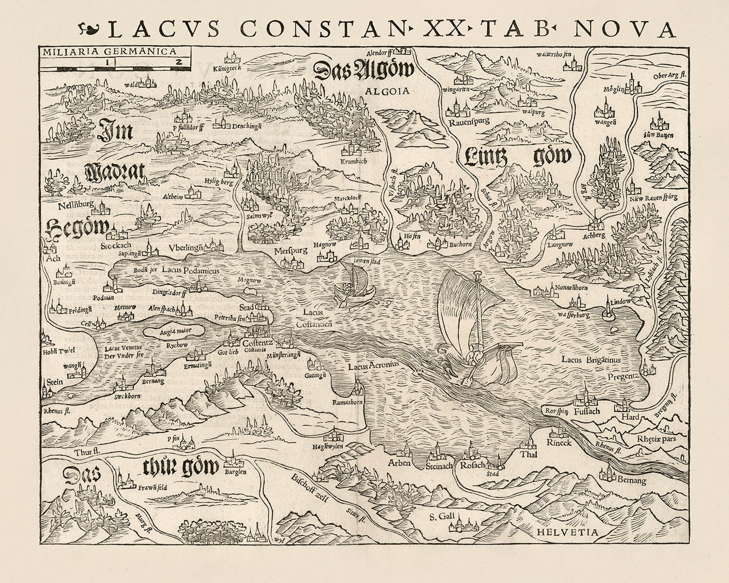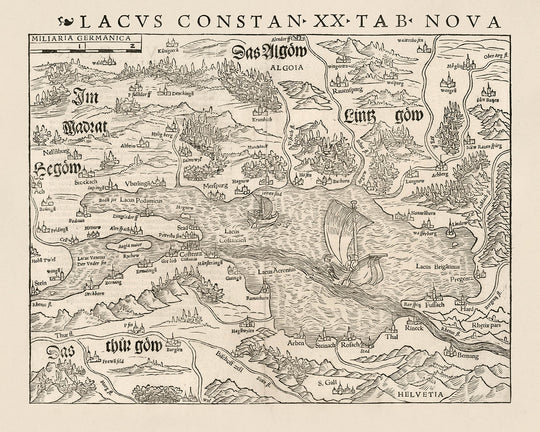 Old Map of Lake Constance by Munster, 1540: German-Swiss-Austrian Border, Konstanz, Lindau, Bregenz, St. Gallen, Holbein Style