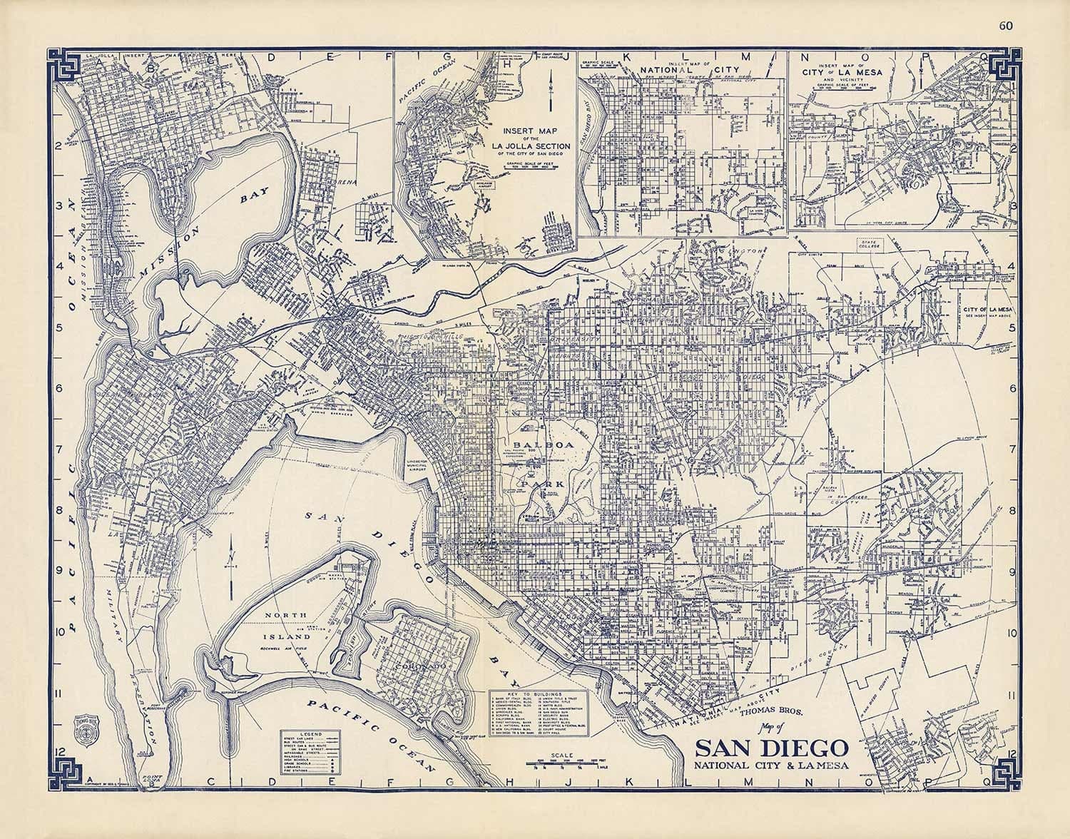 Viejo mapa de San Diego, 1938 por Thomas Bros: Ciudad Nacional, La Jolla, La Mesa, Downtown, Balboa Park & Zoo, Isla Norte