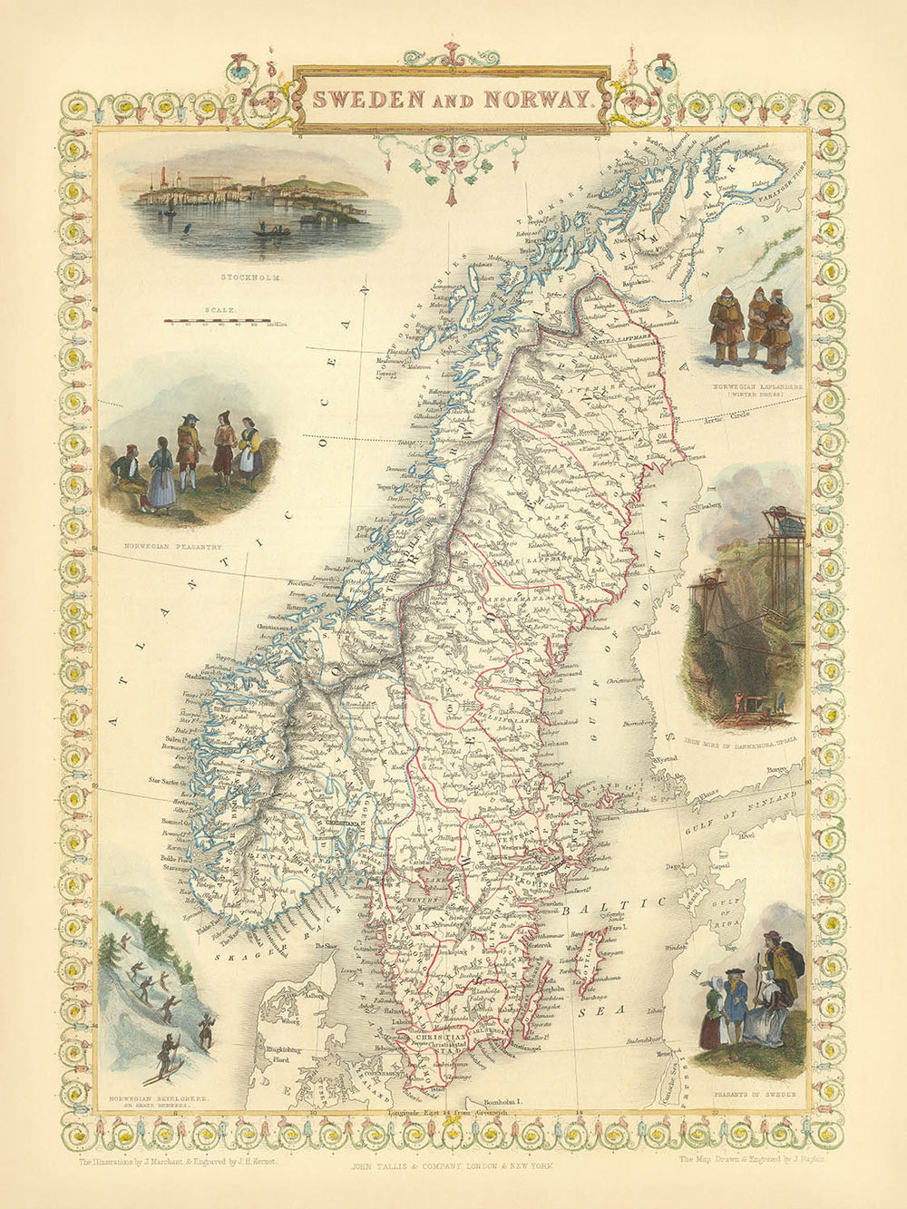 El diseño y estilo de este mapa son esencialmente Tallis, con sus bordes ornamentados y detalles finamente grabados. Los elementos decorativos, combinados con la información geográfica precisa, hacen de este mapa una posesión preciada para coleccionistas y entusiastas de la historia por igual. La importancia histórica del mapa se ve aún más realzada por su representación de actividades tradicionales y escenas indígenas, proporcionando una rica narrativa del paisaje cultural escandinavo. Este mapa no es solo una representación de la geografía, sino una pieza de historia, capturando la esencia de Suecia y Noruega en una era pasada.